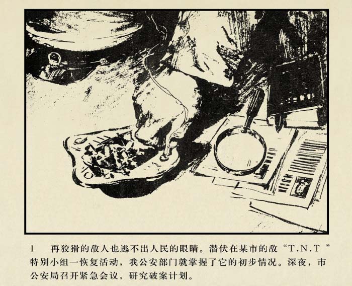 潜伏在某市的敌“T.N.T”特别小组,打算杠我国庆前夕搞一次大的“开花”事件。我高度警惕着的公安部门,及时察觉了敌人的话动。机警的公安战士在侦破工作中,依靠群众,分化敌人,迅速掌握了敌情,在敌人企图炸毁的地方布下了罗网。当狡猾的敌人在他们定下的作案时间里一个一个地伸出魔爪来的时候,也就一个一个地被我当场擒获了。